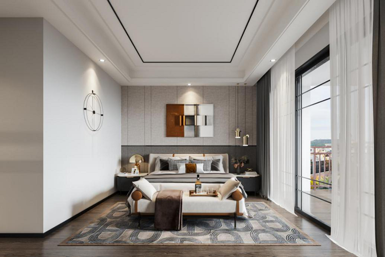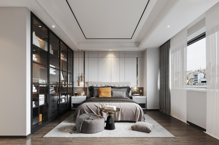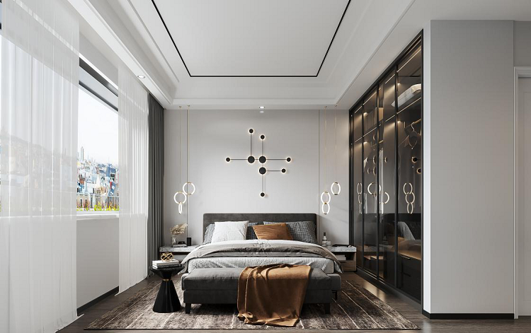 次卧通彻明亮的窗户使得次卧的采光十分通透,整体以白色为主体,在墨色与咖色的搭配下,时尚的质感更加浓厚,现代艺术的气息流淌一室,漫延至空间的每一处细节,更加契合居者对艺术与生活相融的向往与追求。